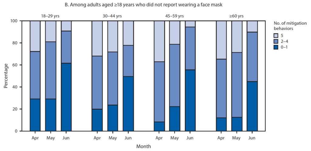 • Findings from the study included that the majority of U.S. adults reported engaging in most or all of the six mitigation behaviors assessed. Age was an important determinant of engagement in mitigation behaviors overall. A smaller percentage of adults aged <60 years, particularly those aged 18–29 years, reported engaging in the mitigation behaviors assessed compared with adults aged ≥60 years. Furthermore, while reported use of face masks increased significantly across all age groups over time, other reported mitigation behaviors declined or did not change significantly across age groups. Finally, compared with adults who reported wearing a mask, those who did not report mask use also reported engaging in significantly fewer other mitigation behaviors during the same period, with significant declines in all other behaviors from April to June.