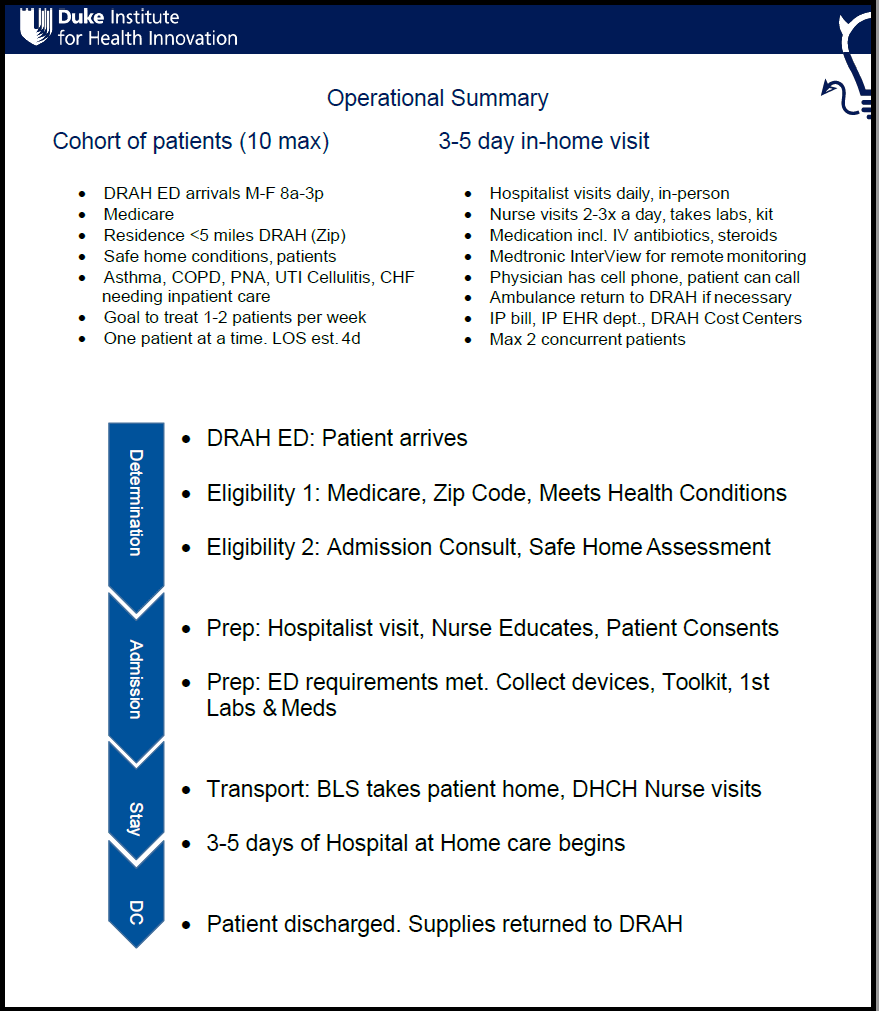 Goals: (1) Prove that we are able to safely provide acute care in the home. (2) Increase efficient bed management at Duke Health inpatient facilities. (3) Provide acute care in a more cost-effective manner.